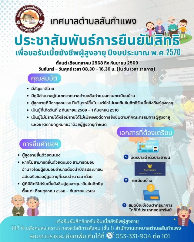 เทศบาลตำบลสันกำแพง ประชาสัมพันธ์ การรับลงทะเบียนยืนยันสิทธิการขอรับเงินเบี้ยยังชีพผู้สูงอายุประจำปีงบประมาณพ.ศ. 2570 ตั้งแต่ เดือนตุลาคม 2568 ถึง กันยายน 2569