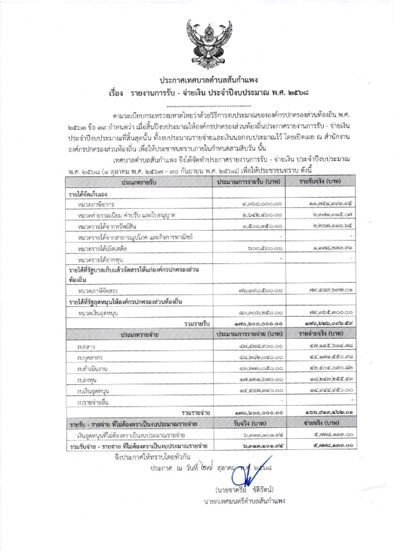 ประกาศเทศบาลตำบลสันกำแพง เรื่อง รายงานการรับ-จ่ายเงิน ประจำปีงบประมาณ พ.ศ.2568