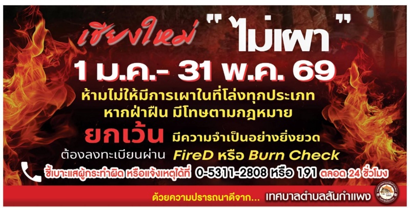 เทศบาลตำบลสันกำแพงประชาสัมพันธ์ กำหนดช่วงเวลา "ไม่เผา" ระหว่างวันที่ 1 มกราคม - 31 พฤษภาคม 2569 พร้อมกำหนด 5 มาตรการป้องกันแก้ไขปัญหาไฟป่าและฝุ่นละอองขนาดเล็ก PM2.5 จังหวัดเชียงใหม่ ปี 256