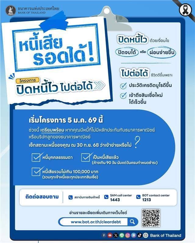 เทศบาลตำบลสันกำแพงประชาสัมพันธ์ร่วมกับธนาคารแห่งประเทศไทย หนี้เสีย รอดได้! กับโครงการ “ปิดหนี้ไว ไปต่อได้” เตรียมตัวให้พร้อมเช็กยอดหนี้ที่เครดิตบูโร สมัครได้ตั้งแต่ 5 ม.ค. 69 เป็นต้นไป