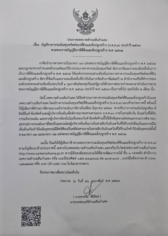 ประกาศเทศบาลตำบลสันกำแพง เรื่อง บัญชีราคาประเมินทุนทรัพย์ของที่ดินและสิ่งปลูกสร้าง (ภ.ค.ส.1) ประจำปี 2569 ตามพระราชบัญญัติภาษีที่ดินและสิ่งปลูกสร้าง พ.ศ.ศ. 2562