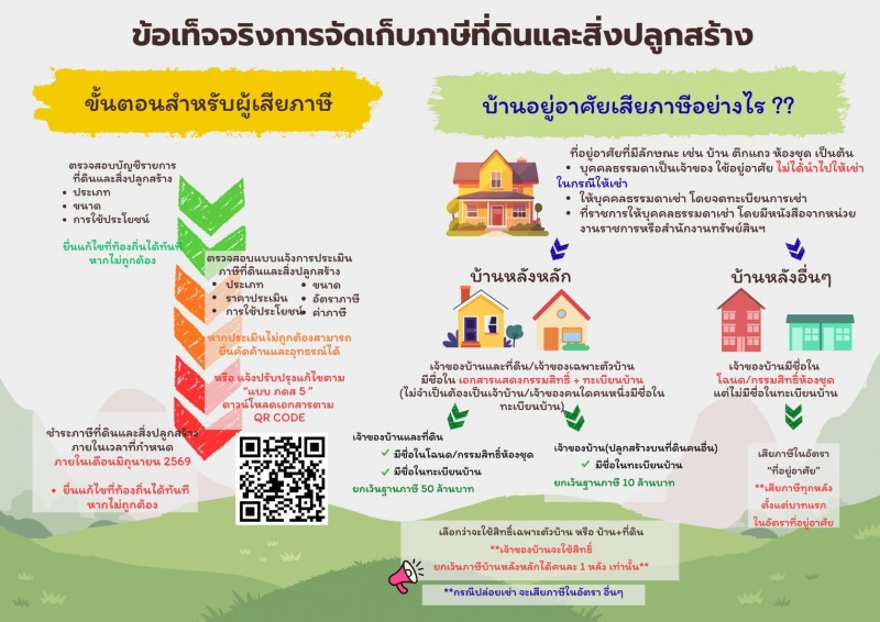 ประกาศแจ้งผู้เสียภาษีที่ดินและสิ่งปลูกสร้างทุกท่านเพื่อประโยชน์ของท่านในการได้รับการประเมินภาษีที่ดินและสิ่งปลูกสร้าง ที่ถูกต้องตามข้อเท็จจริงในการครอบครองที่ดินและปลูกสร้าง