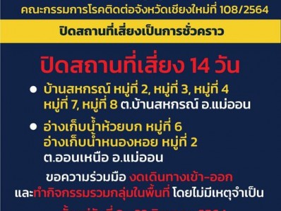 คำสั่ง คณะกรรมการโรคติดต่อจังหวัดเชียงใหม่ที่ 108/2564 ปิดสถานที่เสี่ยงเป็นการชั่วคราว