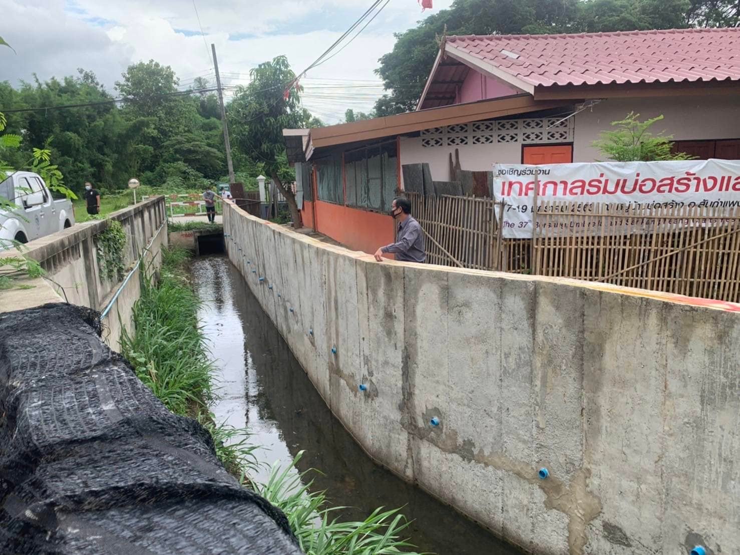 นายชูพงศ์ ธนพรหมาวิวัฒน์ รองปลัดเทศบาลตำบลสันกำแพง ในฐานะประธานฯพร้อมด้วยคณะกรรมการ ร่วมตรวจรับงานจ้างก่อสร้างพนังกันตลิ่ง บ้านเหล่า หมู่ 3 ตำบลสันกำแพง