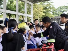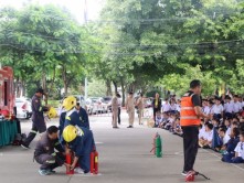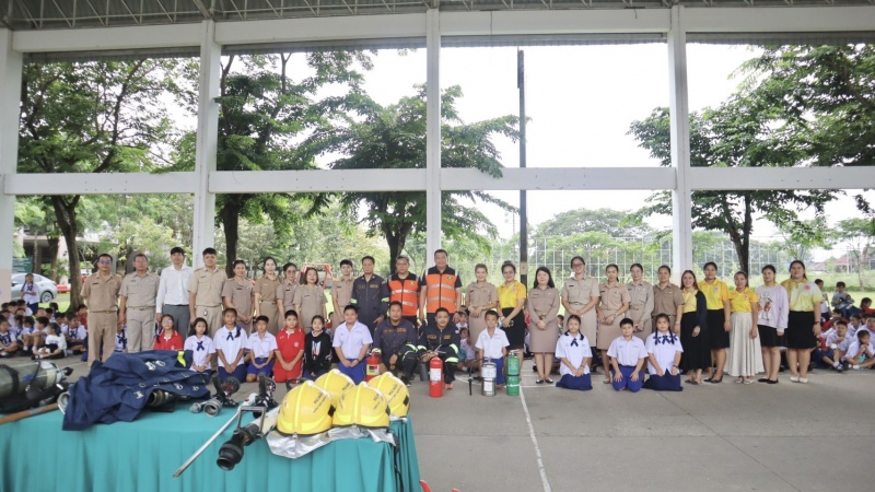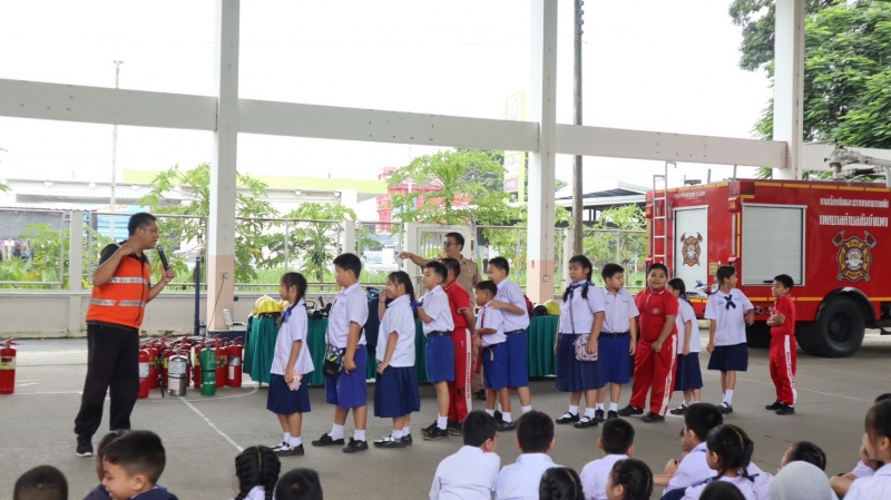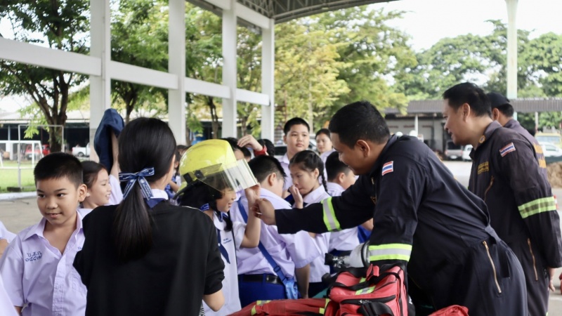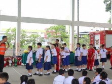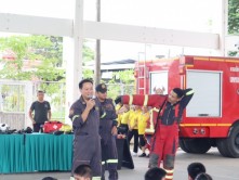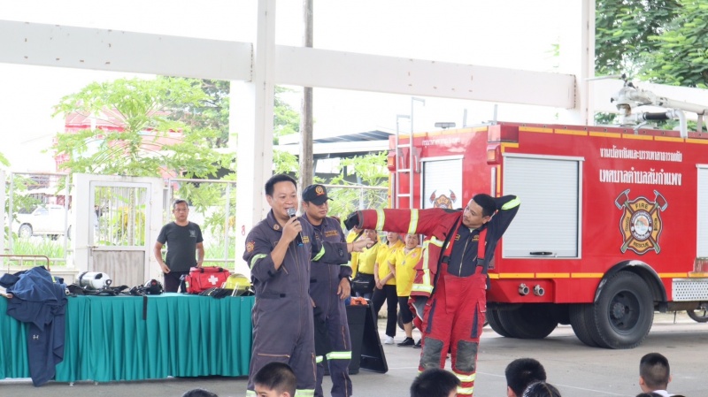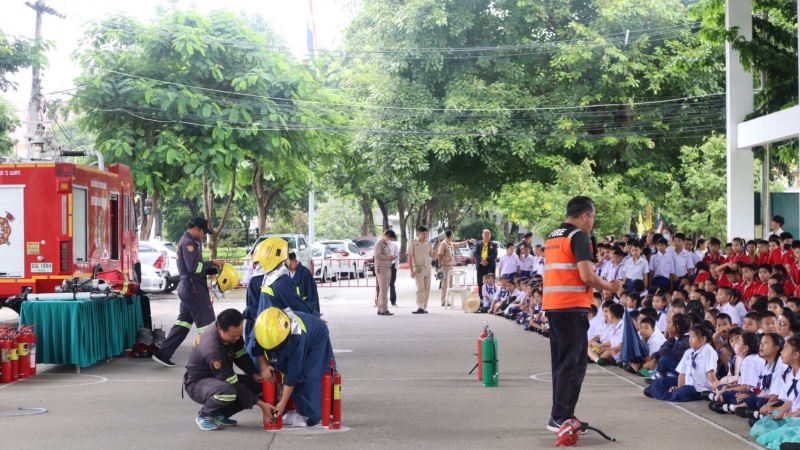 งานป้องกันและบรรเทาสาธารณภัย ร่วมเป็นวิทยากรอบรมการดับเพลิงเบื้องต้นและวิธีปฏิบัติเมื่อเกิดไฟไหม้ แก่คณะครูและนักเรียนโรงเรียนบ้านสันกำแพง ชั้นประถมศึกษาปีที่ 4 - 6