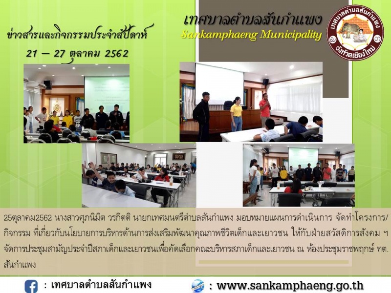 25ตุลาคม2562 นางสาวศุภนิมิต วรกิตติ นายกเทศมนตรีตำบลสันกำแพง มอบหมายแผนการดำเนินการ จัดทำโครงการ/กิจกรรม ที่เกี่ยวกับนโยบายการบริหารด้านการส่งเสริมพัฒนาคุณภาพชีวิตเด็กและเยาวชน ให้กับฝ่ายสวัสดิการสังคม ฯ จัดการประชุมสามัญประจำปีสภาเด็กและเยาวชนเพื่อคัดเลือกคณะบริหารสภาเด็กและเยาวชน ณ ห้องประชุมราชพฤกษ์ ทต.สันกำแพง