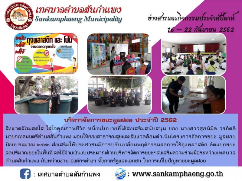 สิ่งแวดล้อมสดใส ใส่ใจคุณภาพชีวิต หนึ่งนโยบายที่ได้ส่งเสริมสนับสนุน ของ นางสาวศุภนิมิต วรกิตติ นายกเทศมนตรีตำบลสันกำแพง มอบให้กองสาธารณสุขและสิ่งแวดล้อมดำเนินโครงการจัดการขยะ มูลฝอย ปีงบประมาณ ๒๕๖๒ ส่งเสริมให้ประชาชนมีการปรับเปลี่ยนพฤติกรรมลดการใช้ถุงพลาสติก คัดแยกขยะ ลดปริมาณขยะในพื้นที่,ลดใช้จ่ายเงินงบประมาณด้านบริหารจัดการขยะฯส่งเสริมความร่วมมือระหว่างเทศบาลตำบลสันกำแพง กับหน่วยงาน องค์กรต่างๆ ทั้งภาครัฐและเอกชน ในการแก้ไขปัญหาขยะมูลฝอย