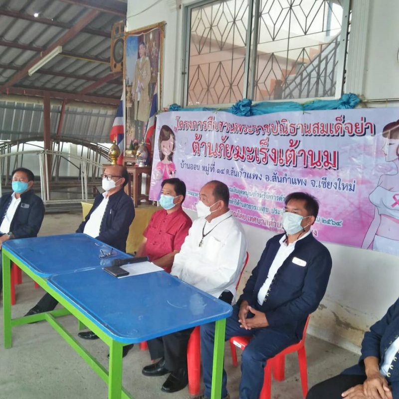 นายชาครีย์ ขัติรัตน์ รองนายกเทศมนตรีตำบลสันกำแพงปฏิบัติราชการแทนนายกเทศมนตรี พร้อมด้วยคณะผู้บริหาร สมาชิกสภาเทศบาล ในพิธีเปิดโครงการพระราชดำริสืบสานพระราชปณิธาน ณ ชุมชนบ้านออนหมู่ 14 โดยได้เชิญวิทยากรจากโรงพยาบาลส่งเสริมสุขภาพบ้านตลาด ตำบลสันกำแพง มาให้ความรู้ต้านภัยมะเร็งเต้านม
