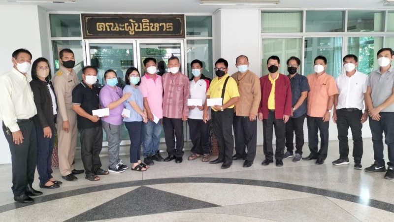 พิธีมอบเช็คสั่งจ่าย ให้กับผู้ใหญ่บ้านแต่ละหมู่บ้าน สำหรับผู้กักตัว 5 หมู่บ้าน